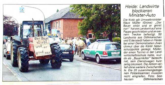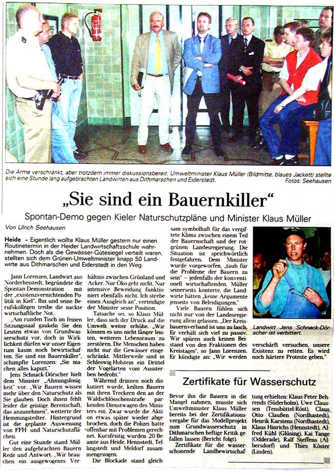 Umweltminister Klaus Müller verteidigt in der Heider Landwirtschaftsschule seine Vogelschutzpolitik mit der er als  Landwirtschaftsminister den Landwirten ihr  Hab und Gut wertlos macht und ihre Zukunft zerstört ---- wie sie ihm vorhalten.