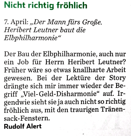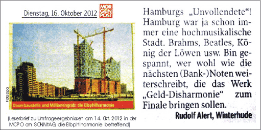 ... die Elbphilharmonie, der disharmonische Paukenschlag* in Hamburgs sinfonischer Baulandschaft. |